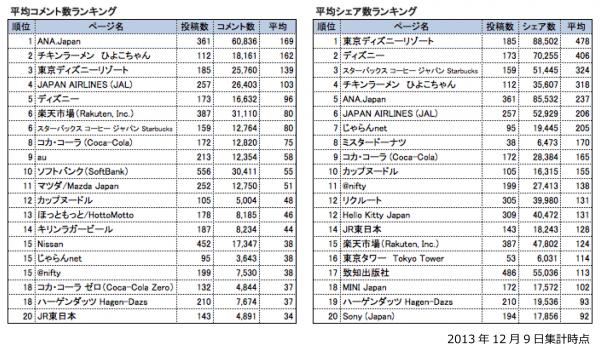 「い いね!」と「シェア」の上位6位までは、企業も並び順もまったく同じランキング結果となったが、「コメント」ランキングでは「ANA.Japan」が1位 となり、ランクインしている企業の顔ぶれも異なる結果となった。「コメント」の数自体も他のランキングに比較すると少なく、「コメント」活用には発展の余 地があると考えられる。「ANA.Japan」「JAPAN AIRLINE」「ほっともっと」は、ユーザーへのコメント返信をしており、企業からの返信数も集計に含まれているが、企業が反応を返すページには、より 「コメント」が集まる傾向があると考えられる。2014年は、一方的な情報発信だけにとどまらず、このようなファンからの貴重なフィードバックをマーケ ティングに活用する企業も増えてくるのではないかと考えられる。また、同じく上位に入る「チキンラーメン ひよこちゃん」や「コカ・コーラ」「ソフトバンク」は、クイズを継続的に投稿しており、その答えをユーザーがコメントすることで、数を増やしている。