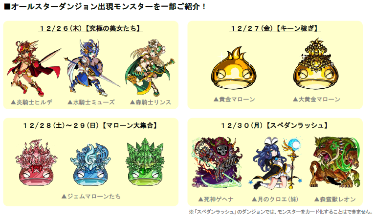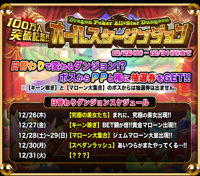 キーンを大量にGETできるダンジョンや、ドラゴンポーカー歴代の大人気モンスターたちが大集合するダンジョンなど、どのスペシャルダンジョンも絶対見逃せない「オールスターダンジョン」となっております!