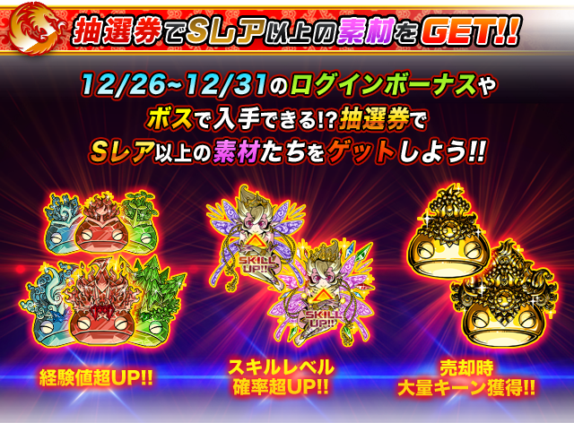 『大抽選ガチャ』からは、Sレア以上の強化素材が必ず出現いたします!!