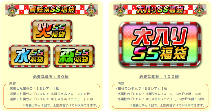 「福袋ガチャ」は、各属性(火・水・森)の3種と「大入り福袋」の全4種類あり、豪華なゲーム内アイテムがぎっしり詰まった、お正月だけの限定ガチャです。
