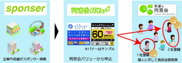 笑屋株式会社(本社:東京都千代田区、代表取締役:真田 幸次)が運営する「笑屋の同窓会」は運営している同窓会に対して、同窓会参加者が自らスポンサーを選ぶ事が出来る「同窓会バリュー」を12月26日よりサービスをスタート致しました。参加者自らスポンサーを選ぶ事によってスポンサー側から商品に興味がある参加者のみにプロモーションを実施する事が可能で、会費を最大無料に下げる事が出来るサービスとなっております。
