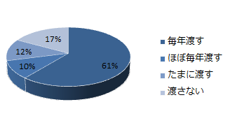 「毎年渡す」「ほぼ毎年渡す」を合わせて7割以上の人が「お年玉」を渡しているという結果になりました。時代が変わっても、「お年玉」は、お正月の恒例行事には代わりはないようです。