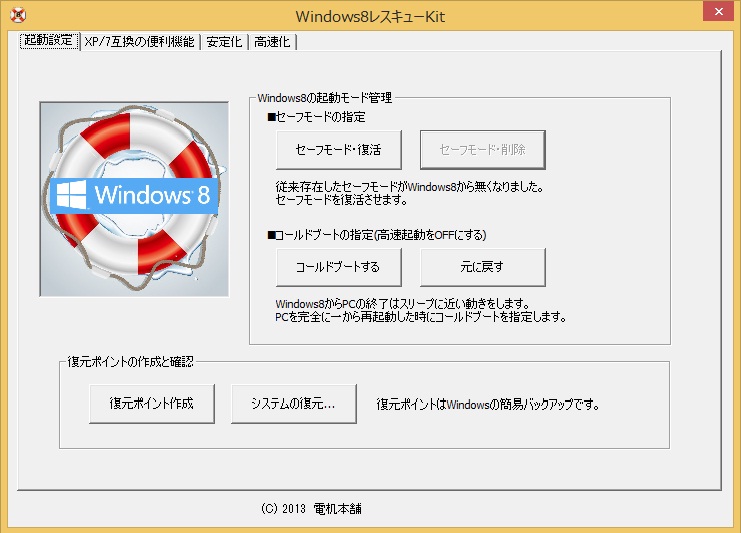 1.セーフモード/スタートアップ設定画面を復活、復元ポイント生成機能と併用して信頼性の向上