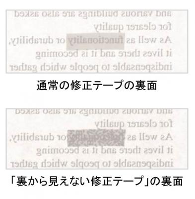 「裏から見えない修正テープ」は、「修正した部分を裏から透かして見ると、修正前の文字が見えてしまう」という