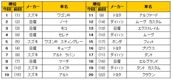 その他の順位も特に大きな動きはありませんでしたが軽自動車やコンパクトカーが中心の