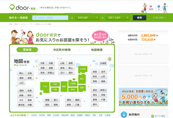 door賃貸は、2010年4月にサービスを開始した「成功報酬型※」の不動産賃貸情報サイトです。サイトユーザーから不動産情報掲載企業様へ物件に関するお問合せがあるまで情報掲載等の費用が一切かからないことに加え、door賃貸経由でご契約いただいたサイトユーザーへ入居お祝い金の特典があるなど、ユニークなサービス形態を採用しております。また、物件を名寄せ整理することで、同一物件情報がまとめて表示されることから、情報の検索性・閲覧性においてユーザビリティの高いサイトとなっております。さらに、2013年6月にはPCサイトを10月にはスマートフォンサイトを全面リニューアルし、一層の機能拡充やブランディング強化を図っております。