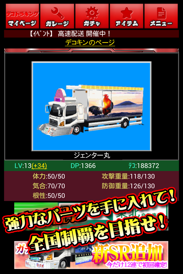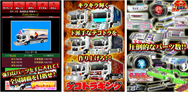 本作は、mobcast初のデコトラ(デコレーショントラック)をテーマにした異色のソーシャルゲームです。プレイヤーは新米のトラックドライバー。「仕事」で経験を積み、パーツを入手・強化しながら、他のプレイヤーとの「バトル」を勝ち抜いて、全国一のデコトラオーナーを目指します。