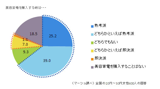 まず、美容家電を購入する際の選び方として、自分が「熟考派」「即決派」のどちらにあてはまると思うかを聞きました。全体(n=600人)で、「熟考派」または「どちらかといえば熟考派」と答えた女性が64.2%を占めましたが、「美容家電を購入することはない」と回答した女性が18.5%おり、これを除いた489人中では、熟考派は78.7%と約8割に上ります。美容家電を即決で選ぶ女性は少数派であることがわかりました。