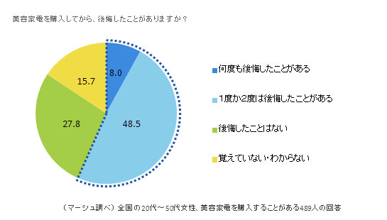 そして、「美容家電を購入して、何らかの理由で後悔したことはありますか」との質問には、「何度も後悔したことがある」という回答が8.0%、「1度か2度は後悔したことがある」が48.5%で、これらを合わせた56.5%、半数強の女性が後悔した経験を持っていました。