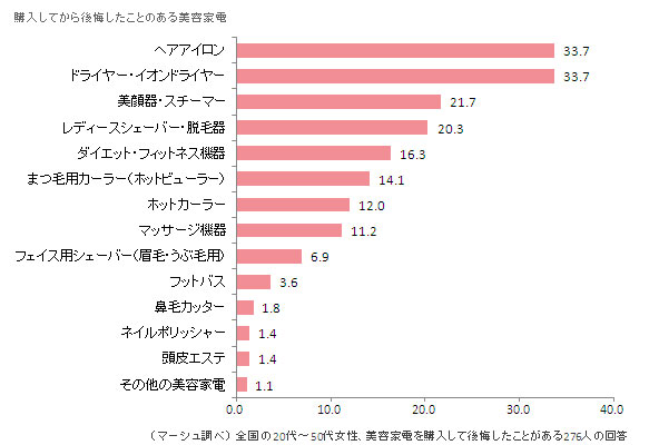 続いて、後悔したことが「ある」と答えた女性だけを対象に、どのような美容家電を購入して後悔したのかを複数選択式で回答してもらいました。その結果、最も多かったのは「ヘアアイロン」と「ドライヤー・イオンドライヤー」(いずれも33.7%)。次に、「美顔器・スチーマー」(21.7%)、「レディースシェーバー・脱毛器」(20.3%)、「ダイエット・フィットネス機器」(16.3%)と続きした。