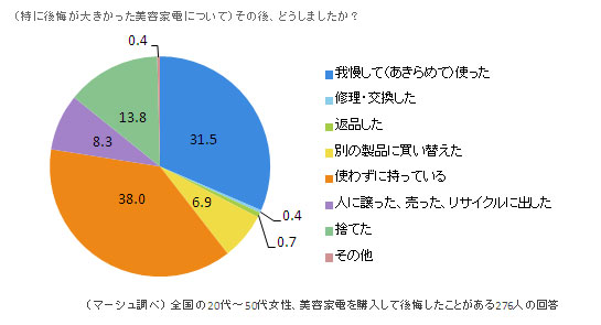 最後に、「(その美容家電を)その後どうしましたか」と聞いたところ、「使わずに持っている」(38.0%)が最も多く、次いで「我慢して(あきらめて)使った」(31.5%)、3番目に多いのは「捨てた」(13.8%)という回答でした。我慢して使う・使わない・捨てるの3つで全体の8割以上を占めており、別の製品を探して買い替えたり、返品や交換をする女性は少ないことがわかりました。
