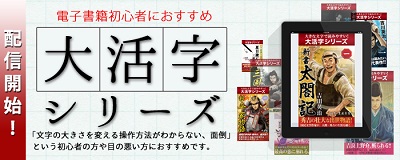 この「大活字シリーズ」は、電子書籍を購入したけれど、「文字の大きさを変える操作方法がわからない、面倒」という初心者から、小さな文字を読むのが不自由な弱視者や高齢者の方でも気軽に電子書籍を楽しめるように、作品内容はそのままで、通常の電子書籍よりも約200%拡大した大きな文字に設定しており、タブレット型電子書籍リーダーでの読書に最適な設定となっています。