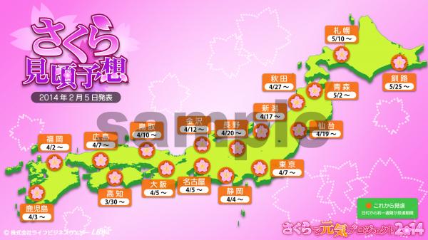 2014年2月5日(水)13時 第1回さくら開花予想発表(予想地点は東北北部から九州)。以降は、毎週水曜日13時に発表。2014年2月26日(水)からは北海道を含めた全国の予想を発表。