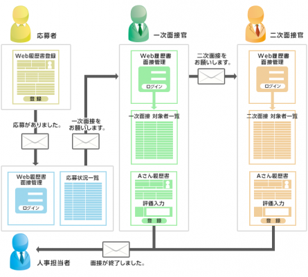「Web履歴書・採用管理サービス」は、採用活動において、応募者の履歴書提出をWebフォームを通じて採用情報データベース化し、書類選考や面接の評価結果をリアルタイムに登録して一元管理することで採用活動の工数を大幅に削減できる人事向けサービスです。