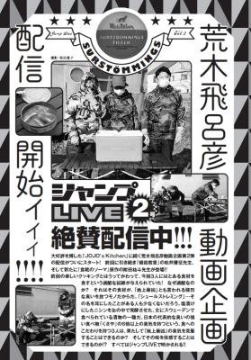 「週刊少年ジャンプ」の新増刊として、2013年8月からスタートしたスマートフォン・タブレット型端末向けの漫画雑誌アプリ「ジャンプLIVE」。第2号では、12月20日(金)から1月31日(金)まで毎日コンテンツを配信中ですが、「ジャンプLIVE」第1号で好評を博した、『ジョジョの奇妙な冒険』の荒木飛呂彦氏と『暗殺教室』の松井優征氏が出演した動画企画「JOJO's Kitchen 荒木飛呂彦パスタを作る」の第2弾JOJO's Kitchen「シュールストレミングを食べてみた!」を1月18日(土)より配信開始いたしました。