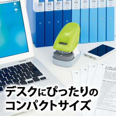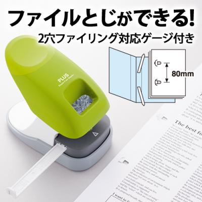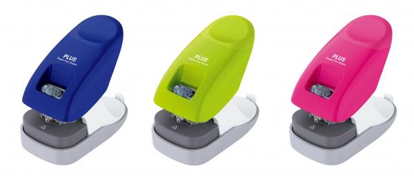 本製品は、枚数の多い書類や資料に対応する12枚とじ。針なしホッチキスで、より枚数の多い書類をとじたいというユーザーの声に応えた、オフィス向けの卓上タイプです。プラス独自の機構「パワーアシストメカニズム」や設計の最適化により、軽いとじ心地と個人のデスクに置いても場所をとらないコンパクトサイズを実現しました。本体カラーは、ブルー・グリーン・ピンクの3色。メーカー希望小売価格(税抜)は2,200円です。