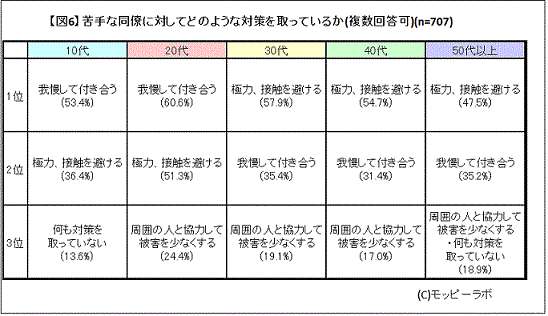 「現在の職場に苦手な同僚がいる」と答えた人に対して「苦手な同僚に対してどのような対策を取っているか」という質問をしたところ、全体1位「極力、接触を避ける」(51.2%)、2位「我慢して付き合う」(42.4%)という結果となった(図5)。同設問を年代別に比較すると、10-20代は1位「我慢して付き合う」、2位「極力、接触を避ける」の順位となったが、30代以上は1位「極力、接触を避ける」、2位に「我慢して付き合う」が選択され、10-20代の順位と逆転した(図6)。若い頃は我慢して苦手な人と付き合うことによって、苦手な同僚を自然に避ける方法を徐々に身に付ける人が多いのかもしれない。