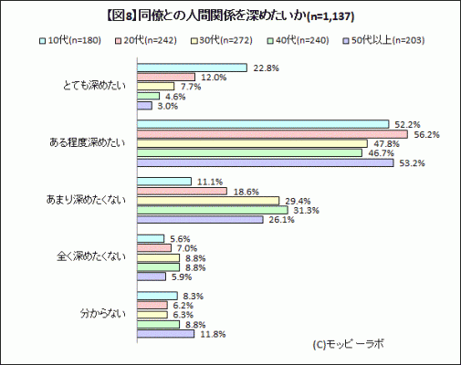 図表参照:【図8】同僚との人間関係を深めたいか(年代別、n=1,137)