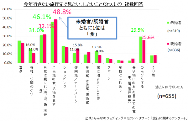 「Q.そこで何を見たいですか。何をしたいですか。(3つまで)」という設問では、未婚者/既婚者ともに「1位:ご当地の食、名物を食す、2位:自然に親しむ(海、山、島、渓谷等)、3位:のんびりする」となりました。未婚者と既婚者では、注目している場所に違いが出ましたが、旅行の目的は未婚者も既婚者も変わらない傾向が見て取れます。