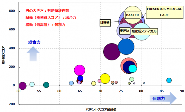 総合力1位Baxterの注目度の高い特許には、腹膜透析に関する技術が多いことが特徴です。総合力2位のFreseniusは低コストで尿毒素を測定する装置に関する特許が、3位の日機装は、血液回路における自動プライミングに関する特許が高い注目度となっています。
