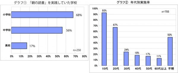アンケート実施期間は2013年10月1日から11月30日までで、学生時代に「朝の読書」を実施していたか、小・中・高校それぞれにチェックをしてもらい、思い出に残っている本のタイトルや学校時代の読書体験の感想などを回答してもらいました。回答していただいた755名の内250名が「朝の読書」を経験しており、半数以上(56%)が20代以下という結果でした。若い世代ほど浸透しており、25年間で広がった運動の成果が裏付けられました。
