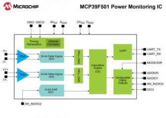 2014年1月29日[NASDAQ: MCHP] -マイクロコントローラ、ミックスドシグナル、アナログ、Flash-IPソリューションのトッププロバイダであるMicrochip Technology Inc. (日本支社: 東京都港区浜松町、代表: 吉田洋介 以下Microchip社)は本日、電力監視IC MCP39F501を発表しました。このデバイスは交流電力のリアルタイム計測向けに設計された高集積単相電力監視ICであり、24ビットΔ-Σ ADC (2回路)、16ビット計算エンジン、EEPROM、柔軟な2線式インターフェイスを内蔵しています。また、低ドリフトの参照電圧源を内蔵し、各計測チャンネルで94.5 dBのSINADを達成しているため、4,000:1のダイナミック レンジでわずか0.1%の誤差という高精度な設計が可能です。