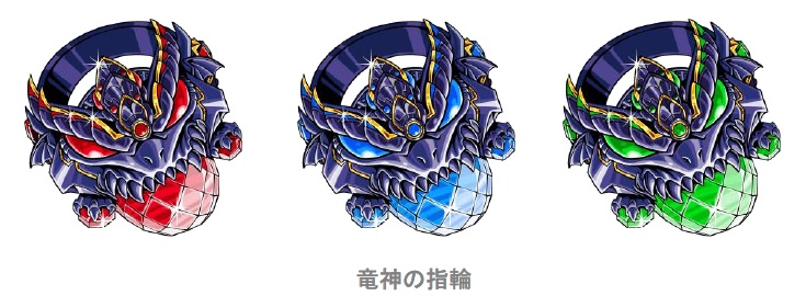 カードを“SSSレア”から“GODレア”に進化させるには、「コロシアム」内に設置された“ドラゴンメダル交換所”で入手できる『竜神の指輪』が必要になります。 (GODレアへ進化させる際は、各カードの属性に合った『竜神の指輪』が必要です。)
