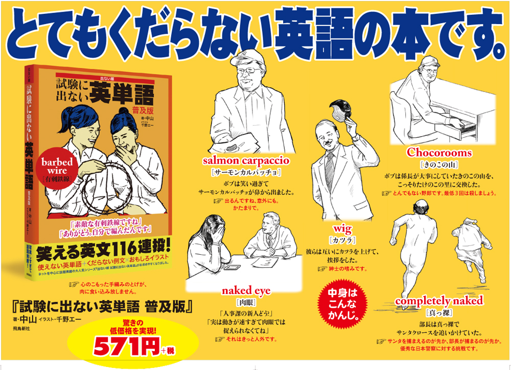 本書は、「Chocorooms(きのこの山)」「barbed wire(有刺鉄線)」など各種英語試験には絶対出題されない使えない英単語がくだらない例文とともに掲載された既刊「出ない順 試験に出ない英単語」(本体1,300円)の廉価版。昨年、シュールな内容が“面白すぎる”とネット上の口コミで話題になったことで一時売上が急増。「ほんをうえる」では、この動きを捉えて廉価版の出版を飛鳥新社に提案し、今回の刊行が決定しました。元本に付属するCDは付かないものの半額以下の本体571円という価格設定。普及版として、1月30日に発売されました。