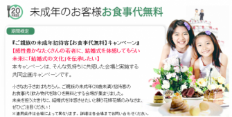 【キャンペーン対象者】:上記キャンペーン期間中『ご親族の未成年招待客【お食事代無料】』対象会場で成約したお客様