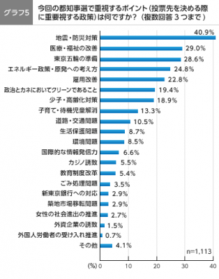 都知事選で投票先を決める際に重要視する政策を3つ以内で回答していただくと、最多は、「地震・防災対策」40.9%、次いで「医療・福祉の改善」29.0%、「東京五輪の準備」28.6%、「エネルギー政策・原発の考え方」24.8%、「雇用改善」22.8%と続きました。