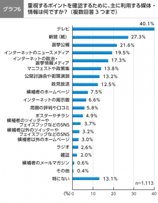 前述の投票先を決める際に重要視するポイントを確認するために主に利用する媒体をたずねると、テレビ40.1%、新聞27.3%、選挙公報21.6%など、既存メディアの利用率が高いことがわかりました。