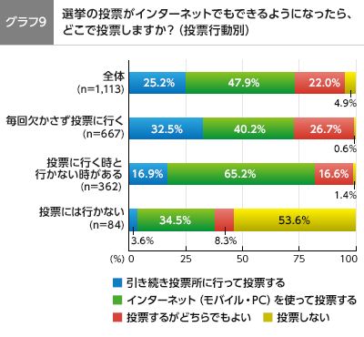 普段の投票状況(欠かさず投票に行く/投票には行かない/投票に行くときと行かないときがある)別にみると、ネット投票解禁で、普段「投票に行くときと行かないときがある」と回答した有権者の65.2%が、ネットを使って投票すると回答しており、ネット投票が投票率向上に寄与する可能性を示唆しました。