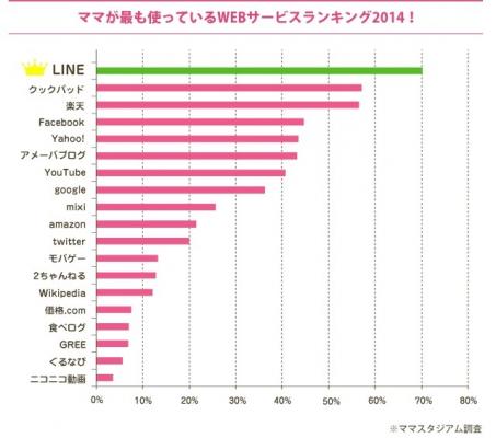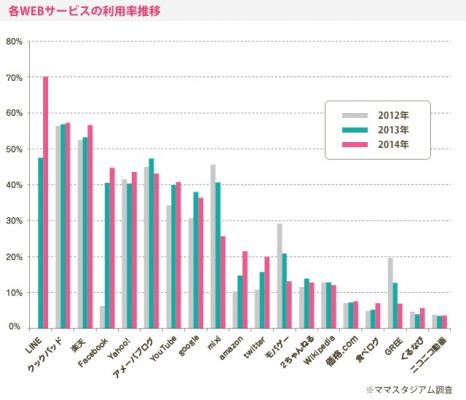 ママに最も使われているWEBサービス第1位は、昨年3位だった『LINE』が奪取。利用率は70%を超え、ママ達の間でもコミュニケーションインフラとしての地位を確立しています。2位、3位は『クックパッド』と『楽天』が続き、それぞれ昨年より順位はひとつ落としていますが利用率は伸長させており、引き続きママ達から高く支持されています。
