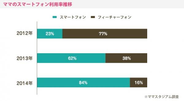過去三回の調査において、ママのスマートフォン利用率は23%から84%へ飛躍的に伸長しました。利用デバイスの変遷が利用するサービスの選択にも影響していることが推察されます。