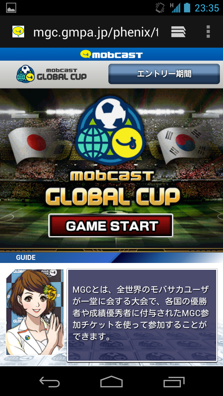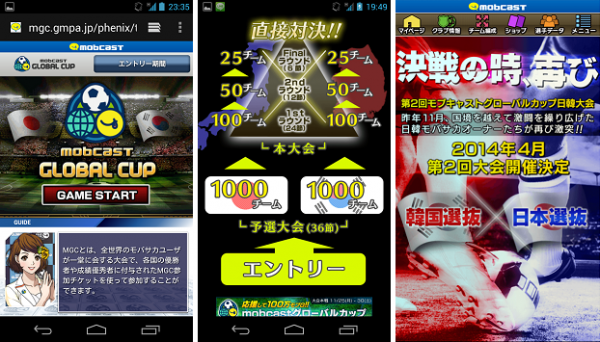 「mobcastグローバルカップ」(以下、MGC)日韓大会とは、日本と韓国それぞれの国のmobcastプラットフォーム上でモバサカをプレイしているユーザーの中から、代表となる精鋭を選出し、両国で戦い合うソーシャルゲーム初の日韓戦です。昨年おこなわれた第1回大会本大会(2013年11月25日~30日)においては、激戦の末に韓国が勝利。大会期間中は、日韓のユーザー間で6千件を超える頻繁なカードトレードがおこなわれた他、3万人を超えるユーザーが両国の応援に参加するなどの盛り上がりを見せ、オンラインゲームにおける“国際試合”の可能性が示されました。