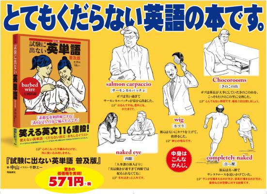 『出ない順 試験に出ない英単語 普及版』は、各種英語試験に出題されないような“使えない英単語”をくだらない例文とともに紹介した既刊『出ない順 試験に出ない英単語』(本体1,300円)の廉価版。昨夏ネット上で話題となり、一時期売上が急増したことを捉え、「ほんをうえる」から廉価版の出版を飛鳥新社に提案し、1月30日に刊行されました。