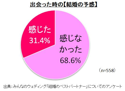 「パートナーと出会った時の「結婚の予感」について教えてください。」という設問では「感じた」が31.4%となり、「感じなかった」が68.6%と差が出ました。