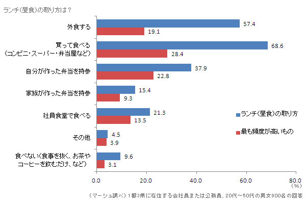 まず、仕事がある日のランチ(昼食)の取り方について複数回答で聞いてところ、最も多かったのは「買って食べる」という回答で68.6%となり、57.4%の「外食」を約10ポイント上回りました。