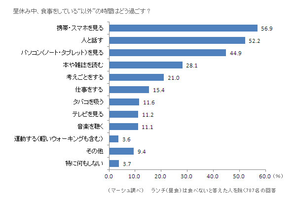 次に、休憩時間中の“食事以外”の時間をどのように過ごすことが多いかを複数回答でたずねたところ、最も多かったのは「携帯・スマホを見る」で56.9%でした。次に多いのは「人と話す」(52.2%)ですが、3番目に多いのは「パソコン(ノート・タブレット)を見る」(44.9%)となり、空き時間にパソコンやスマートフォンを使用する人が多いことがわかります。