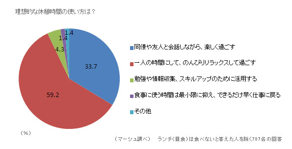 続いて、最も理想的だと思う休憩時間の使い方として、自分の考えに合うものを1つだけ選択してもらったところ、「一人の時間にして、のんびりリラックスして過ごす」が59.2%で最も多く、一人でゆっくりできることが理想的であると考える人が多い結果となりました。次に多かったのは、「同僚や友人と会話しながら、楽しく過ごす」(33.7%)で、人とコミュニケーションを取って楽しく過ごすことが理想的だと考える人は3割強という結果になりました。「勉強や情報収集、スキルアップのために活用する」を選択した人は、4.3%でした。
