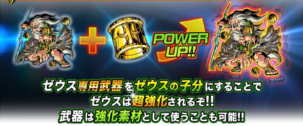 ゼウス専用の武器や防具はモンスターの強化用素材としても使用でき、一部の「神族」モンスターの強化で使用すると、得られる効果が“2倍”にUPします。