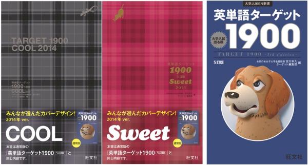 今回刊行する『英単語ターゲット1900[5訂版]』特装版は、『英単語ターゲット1900[5訂版]cool2014 』 / 『英単語ターゲット1900[5訂版]sweet2014』の2種類です。2013年11月から12月まで、全国書店の店頭およびwebサイトにて、読者投票によるカバーデザインコンテストを開催。「COOL=かっこいい」、「SWEET=かわいい」をコンセプトにした8種類のカバーデザイン候補から選ばれました。「毎日持ち歩く英単語集だからこそ、自分の気に入ったカバーデザインを選べたらよいのでは」というアイデアから生まれた企画です。シャープなCOOLバージョン、かわいいSWEETバージョン、通常版の3種類の中から好みの『英単語ターゲット1900』を選ぶことができます。