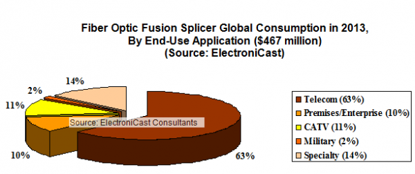 ElectroniCast社によると、2013年における光ファイバ融着接続機の世界市場において電気通信業がその消費額の63%をしめており、特殊用途での融着接続機の使用は2013-2018年の間に年平均成長率7.6%の増加が見込まれる。プライベートエンタープライズネットワーク、ケーブルテレビ、軍事/航空宇宙アプリケーションにおける融着接続機の消費についてもまた、本レポートでは定量的な情報を提供する。