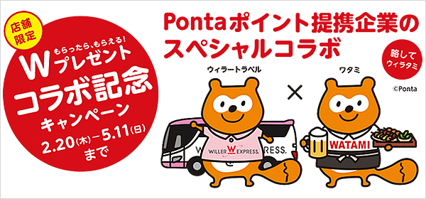 移動ポータルサイトを運営するWILLER TRAVEL株式会社(http://travel.willer.co.jp、代表取締役:村瀬 茂高、以下ウィラートラベル)は、ワタミフードサービス株式会社(http://www.watamifoodservice.jp/、代表取締役社長:桑原 豊、以下ワタミ)と提携し、相互の利用者に向けて新しいサービスの提供を始め、これを記念して本日より『Wプレゼント コラボ記念キャンペーン』を開始します。