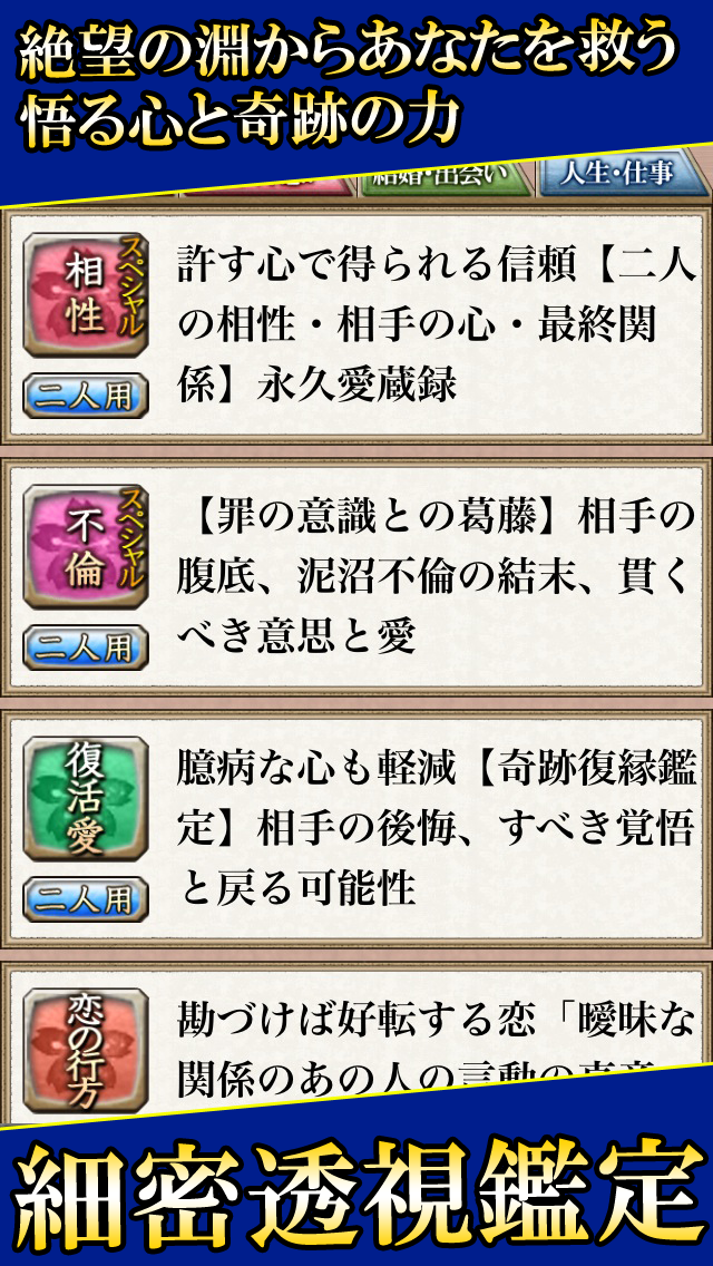 無料鑑定では『今あなたが気づくべきこと』『あなたの現状についてお話しします』『あの人の現状についてお話しします』の3種類。さらに有料鑑定では、“恋愛”の悩みはもちろん、“結婚”の悩み、“人生”の悩みなど、さまざまな悩みに対応した鑑定メニューを多数ご用意しております。