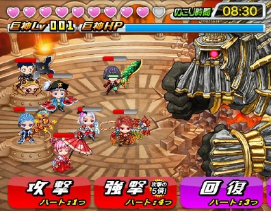 本イベントは、他メンバーとの連携型バトルイベントです。最大7人で協力し、『巨神』とのバトルに挑みます。通常フィールドを探索していると巨神が稀に出現し、即バトルへと進展します。ユーザーは“ハート”を消費して実行する『攻撃』『強撃』『回復』の3種類のコマンドを使って巨神の討伐を目指します。