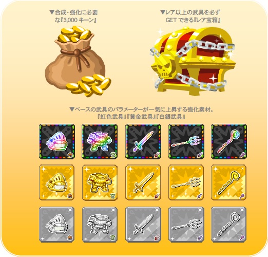 見事10分以内に巨神討伐を成功させると、報酬として『武具強化素材(全種類から1つ)』『レア宝箱』『3,000キーン』の中から1つランダムで、獲得することができます。手に入れた報酬で武具を強化し、大幅に戦闘力を上げるチャンスです。