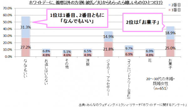 「Q.ホワイトデーで、義理以外の方(例:彼氏/夫)からもらったら嬉しいものについてお聞きします。1番目にもらったら嬉しいもの、2番目にもらったら嬉しいもの、は何ですか。それぞれお答えください 」という未婚・既婚女性への設問では、1位が「なんでもいい(1番目27.2%/2番目31.3%)」となり、次いで「お菓子(1番目25.0%/2番目18.9%)」「ジュエリー・アクセサリー(1番目21.8%/2番目14.9%)」となり、1番目にもらったら嬉しいもの、2番目にもらったら嬉しいもの、それぞれ同順位となりました。