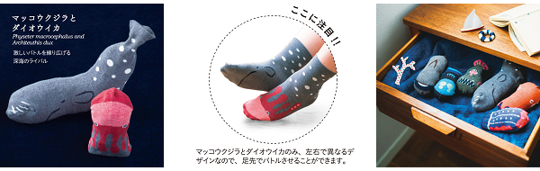 魚が大好きで学生時代は水族館でアルバイトをし、休日には各地の水族館を制覇し、魚を研究するサークルを主宰するほど魚好きな魚女(ぎょじょ)新人プランナーが、好きが高じて開発したこだわりの商品です。靴の中で隠れて見えない暗い世界と深海の共通性をインスピレーションに「靴下で深海魚を!」というひらめきから企画がスタート。魚女ならではの細かいディテールの再現のために試作を重ねたこだわりのデザインで、ユーモラスでかわいく、収納時にも深海魚たちのマスコットとして楽しめる商品に仕上がりました。マッコウクジラとダイオウイカなど左右でデザインが違うものもあり、深海の世界さながら、足先でバトルをさせることもできます。