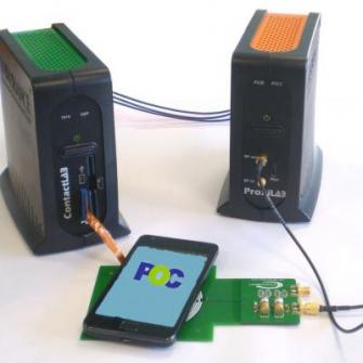 これらの最新の仕様に基づいて、テスト仕様に応じたテストスクリプト化されております。実際のテスト環境は、テスト対象のCLFボードやNFCモバイル端末に対して、非接触部分は、PCDテストアンテナと非接触型エミュレータを準備しています。テスト対象がもつ接触部分のSIMソケットに対して、SIMケーブルを差し込み、接触型エミュレータと接続します。これらの2つのエミュレータは、WindowsPCと接続をして、非接触型エミュレータ、テスト対象、接触型エミュレータ間のテスト項目に応じて、自動的に仮想環境を構築することが可能です。そして、エミュレータの自動コントロールと検証テストプログラムのテスト開始、テストレポート作成ができるに仕組みとなっています。また、テストスクリプトは、自由にカスタムロジックを入れたプログラム修正追加もできる仕組みとなっています。
